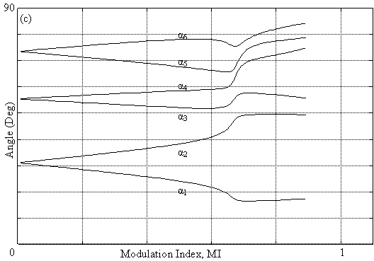 This note is also valid for fig. 3b, fig. 3c, and fig. 3d; however in the interval 0.6 < MI < 1.1 these trajectory become non linear, thus a more refinement of the algorithm is carried out to obtain the solutions in this interval. As for fig. 3e and fig. 3f, the system has no solutions beyond MI > 0.6. We conclude from fig. 3 that maximum of the modulation index diminish with the increase of the harmonics number eliminated illustrated. For some values of R, the trajectories of the angles get nearer which implies a decrease in the width of pulses [3].