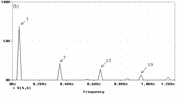 On the basis of the Pspice program various simulations have been undertaken. Fig.5 illustrates the results for the case: R = 2 and MI = 0.8, fig. 5a represents the line voltage and fig. 5b its harmonics spectra.